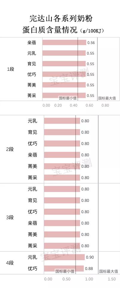 ①完达山各系列全段的蛋白质含量均符合中国国标。具体蛋白质的优劣,在后面的特色强化配方分析中会涉及。