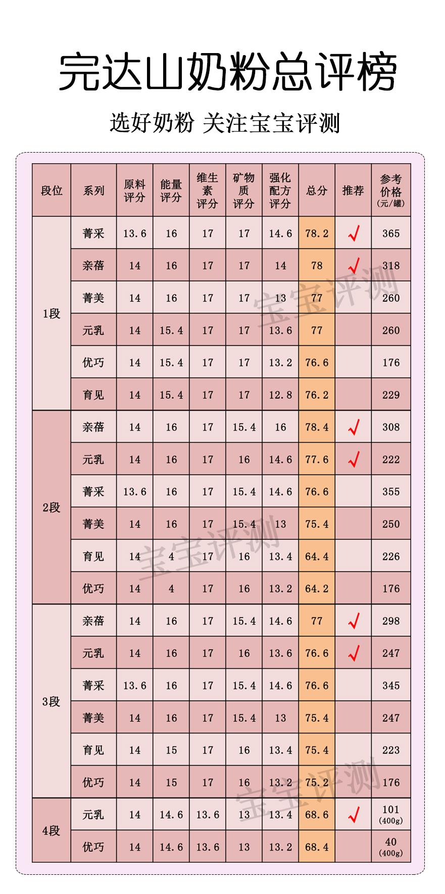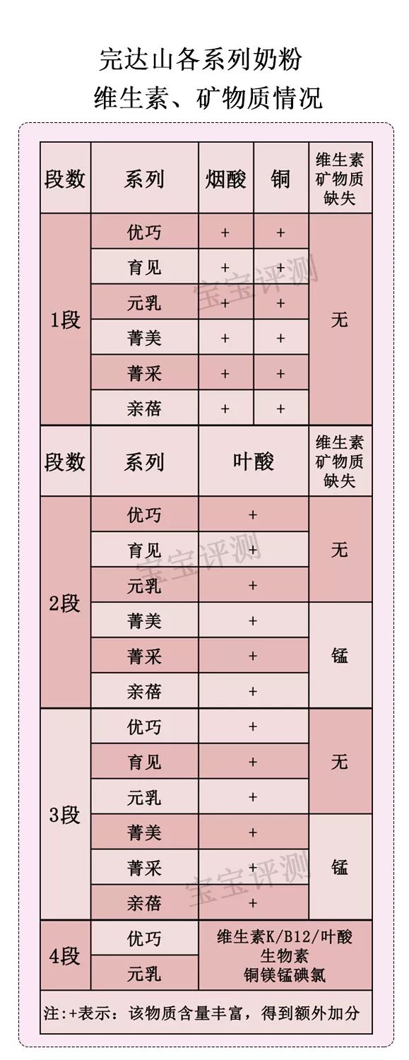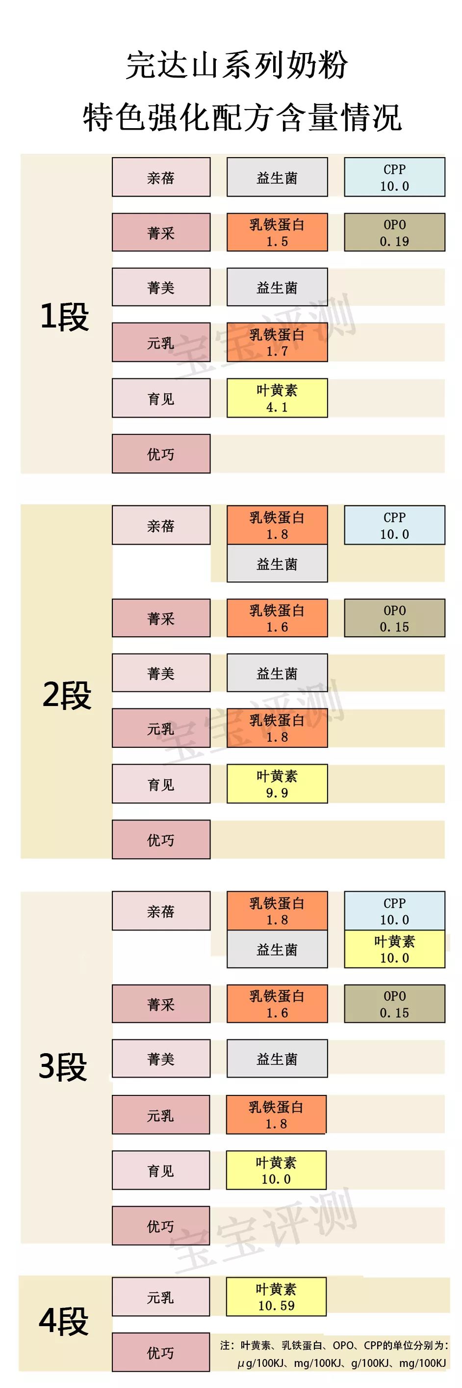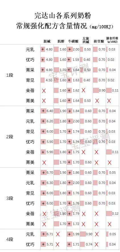 ④亲蓓、菁美1-3段,元乳、优巧4段,缺乏多种常规强化配方,其他系列各段则添加齐全。